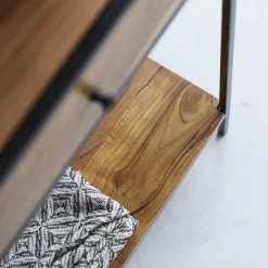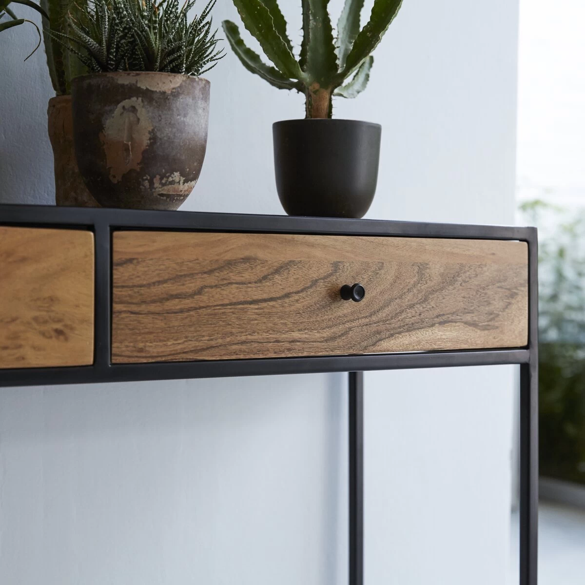 Directement inspiré des anciennes usines, ce petit meuble affiche sa belle sobriété au séjour, dans une entrée ou au salon… On place dans les tiroirs tous ces petits objets qu’on ne veut pas voir traîner mais qui nous sont pourtant indispensables au quotidien : les clés, le courrier, les stylos, le papier brouillon… Pour un effet déco encore plus réussi, vous pouvez, comme sur notre photo, y placer différentes variétés de plantes ou des objets déco, des cadres photos… Vous pouvez aussi lui dédier un rôle plus pratique et la transformer en petit bureau écritoire. Quel que soit l’usage que vous en ferez, la console en métal et acacia Agra conférera à votre intérieur un petit air vintage très apprécié dans la déco d’aujourd’hui.