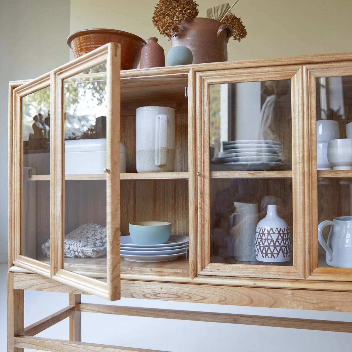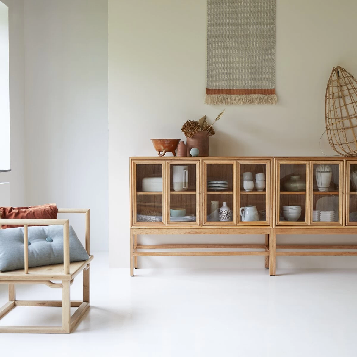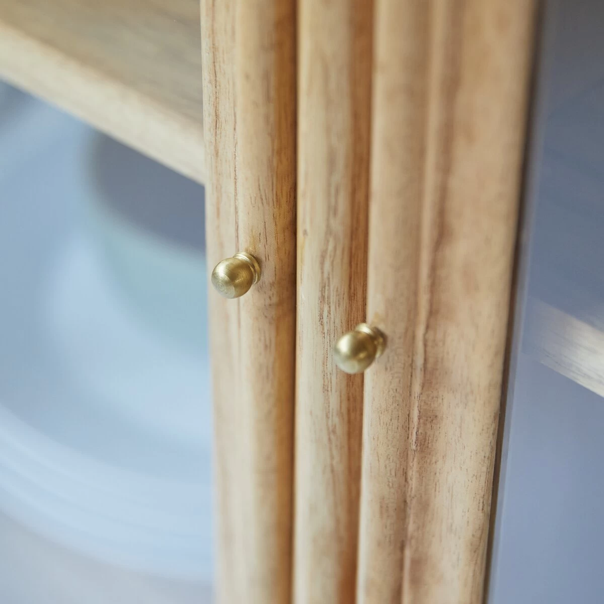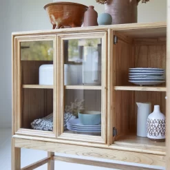 La vitrine basse Alex s’impose par l’élégance intemporelle de ses lignes, la blondeur de son bois naturel (le mindi) et les finitions soignées.