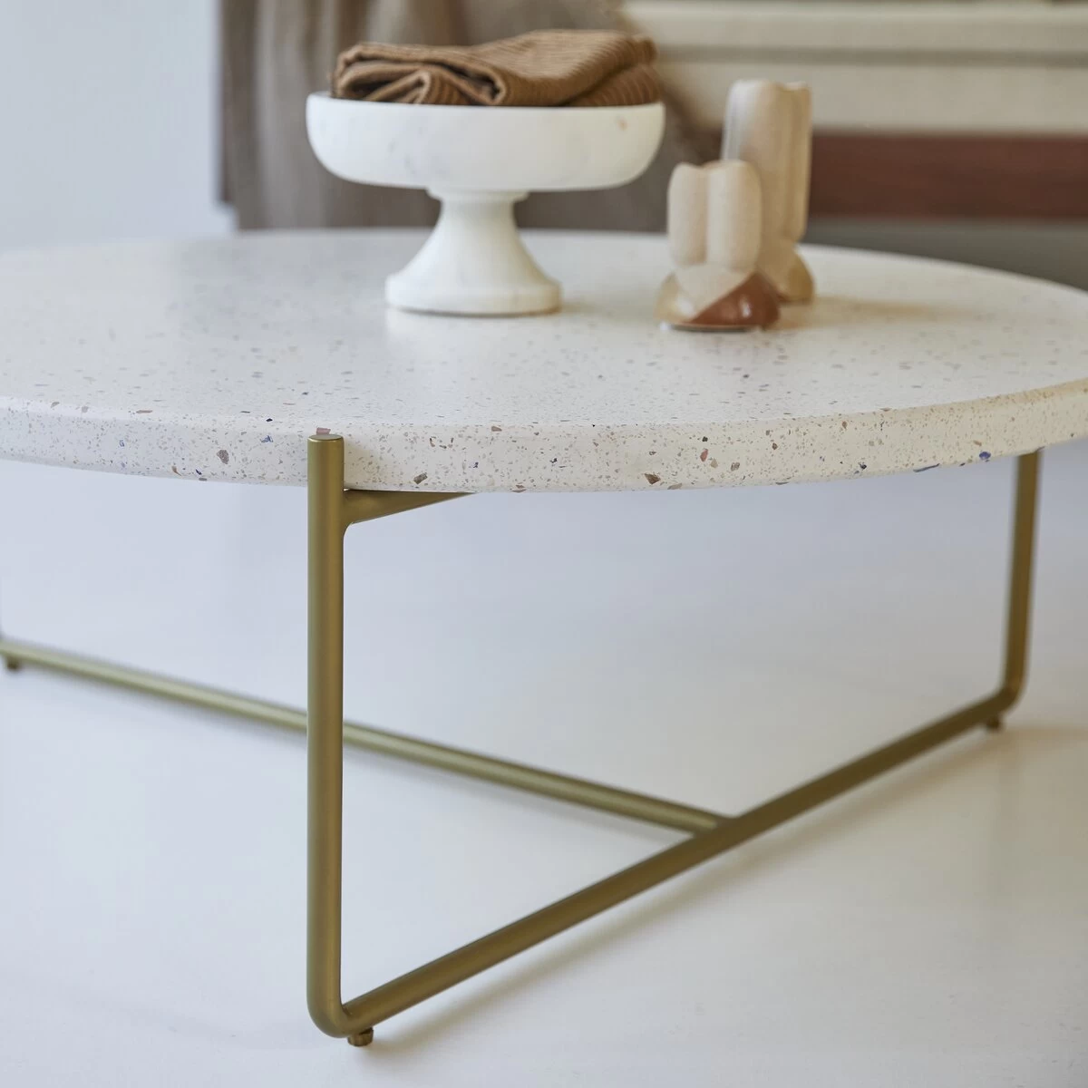 Gaie et colorée, la table basse en laiton et terrazzo 80 Anatole Confetti, appelé aussi granito affiche sa créativité et son design moderne !
