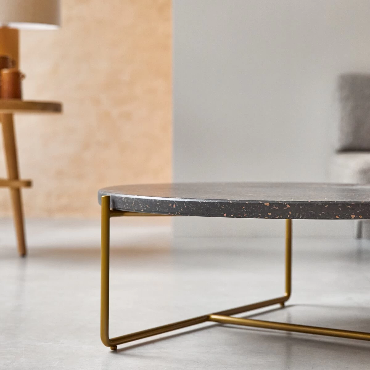 Très originale et pleine de personnalité, la table basse en laiton et terrazzo 80 Anatole grey, combine avec brio esprit très actuel, design minimaliste et lignes tout en rondeur.