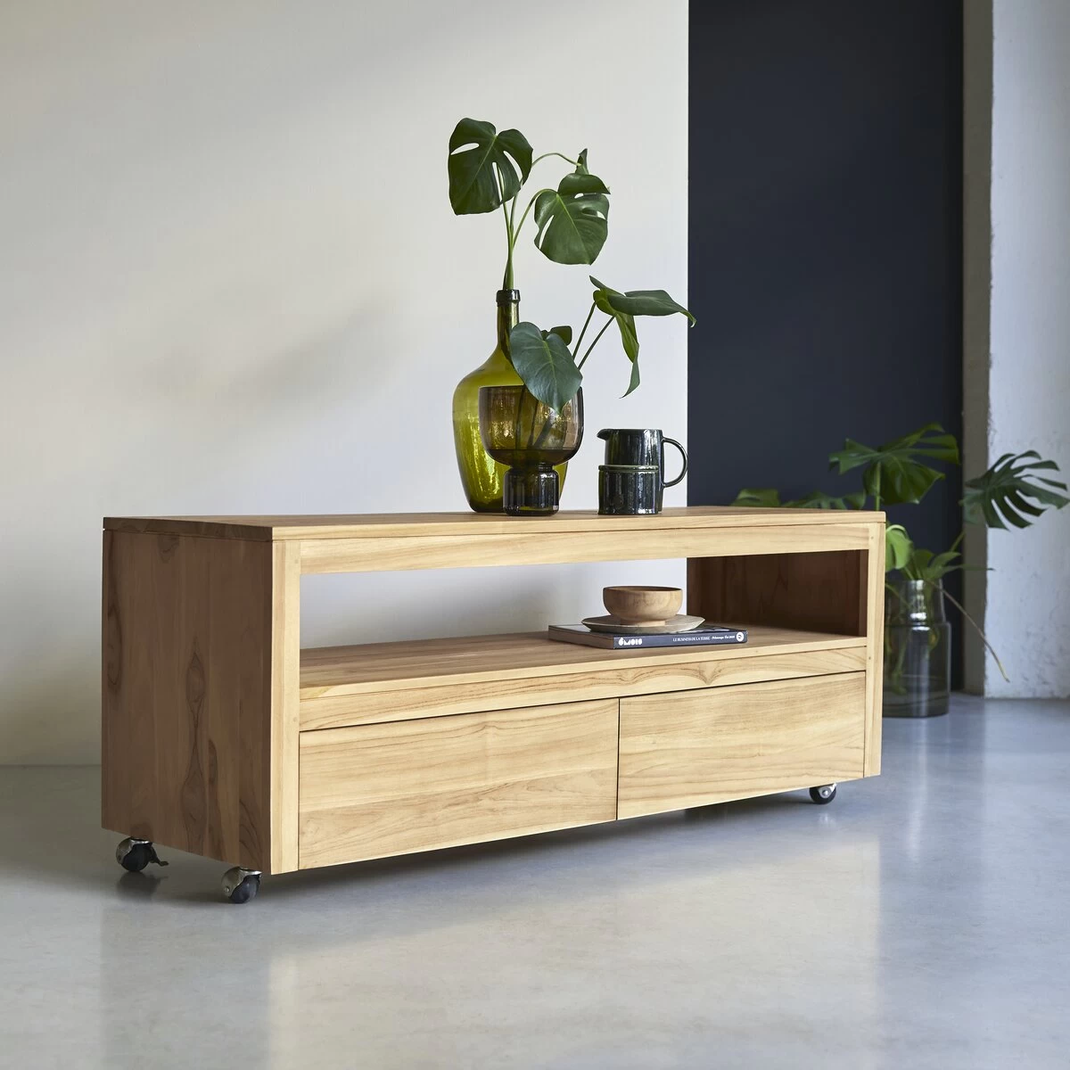 Très beau meuble TV en teck massif certifié FSC® sur roulettes. Laissez-vous charmer par son style ultra contemporain et ses finitions de grande qualité !