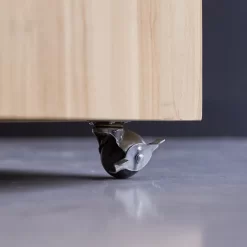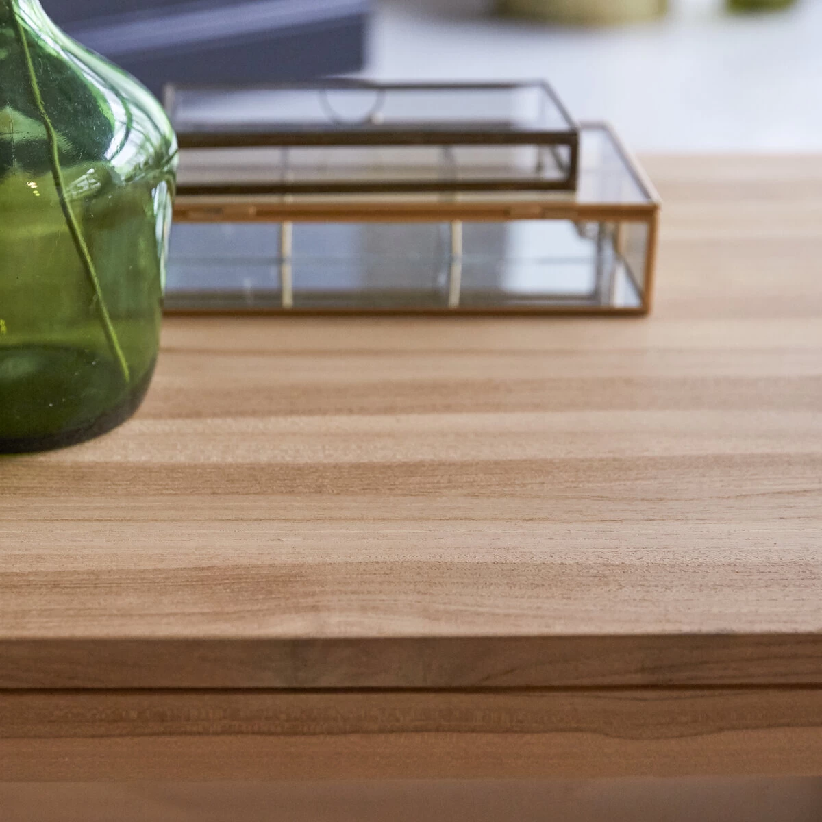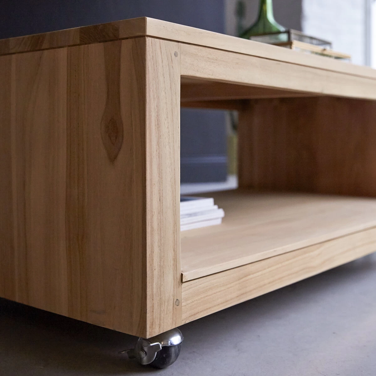 On aime la blondeur de son teck de belle qualité, la perfection de ses lignes épurées et le côté pratique de ses roulettes qui permettent de la déplacer au gré des envies ou des besoins.