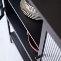 Envie de style sans tout changer dans la maison ? Le bahut en métal Antonin permet de twister facilement l’atmosphère d’un lieu ! D’inspiration industrielle, il réussit l’accord parfait de deux matériaux dissemblables : le métal lisse protégé par un revêtement en poudre (qui ne gomme pas l’apparence nette du métal) et le verre trempé opaque qui laisse deviner sans dévoiler ce qu’il contient. De très belle facture, ce bahut permet de ranger avec une élégance intemporelle, la vaisselle et le linge de table. Une tablette à la base autorise l’exposition de jolis objets… vous pouvez aussi décider d’y placer des livres, des caisses d’objets. Les portes dotées d’une discrète poignée restent bien fermées grâce à des aimants judicieusement placés.