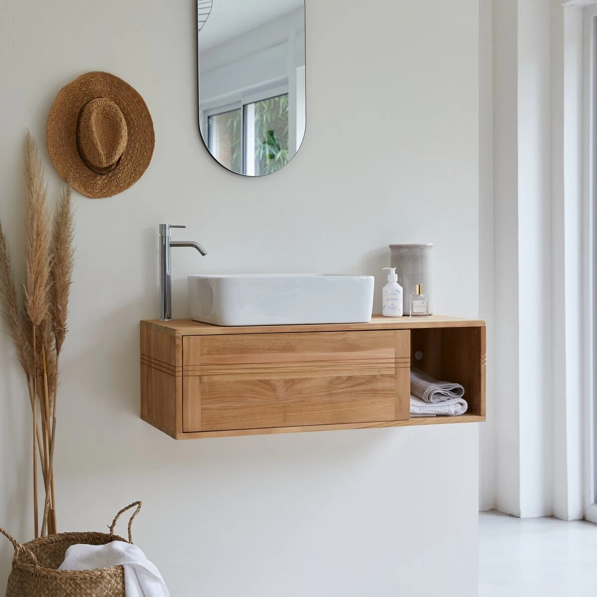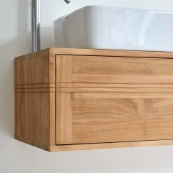 Laissez-vous tenter par cet élégant meuble de salle de bain suspendu en teck massif certifié FSC® !