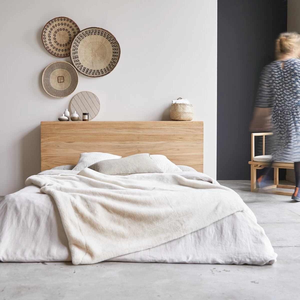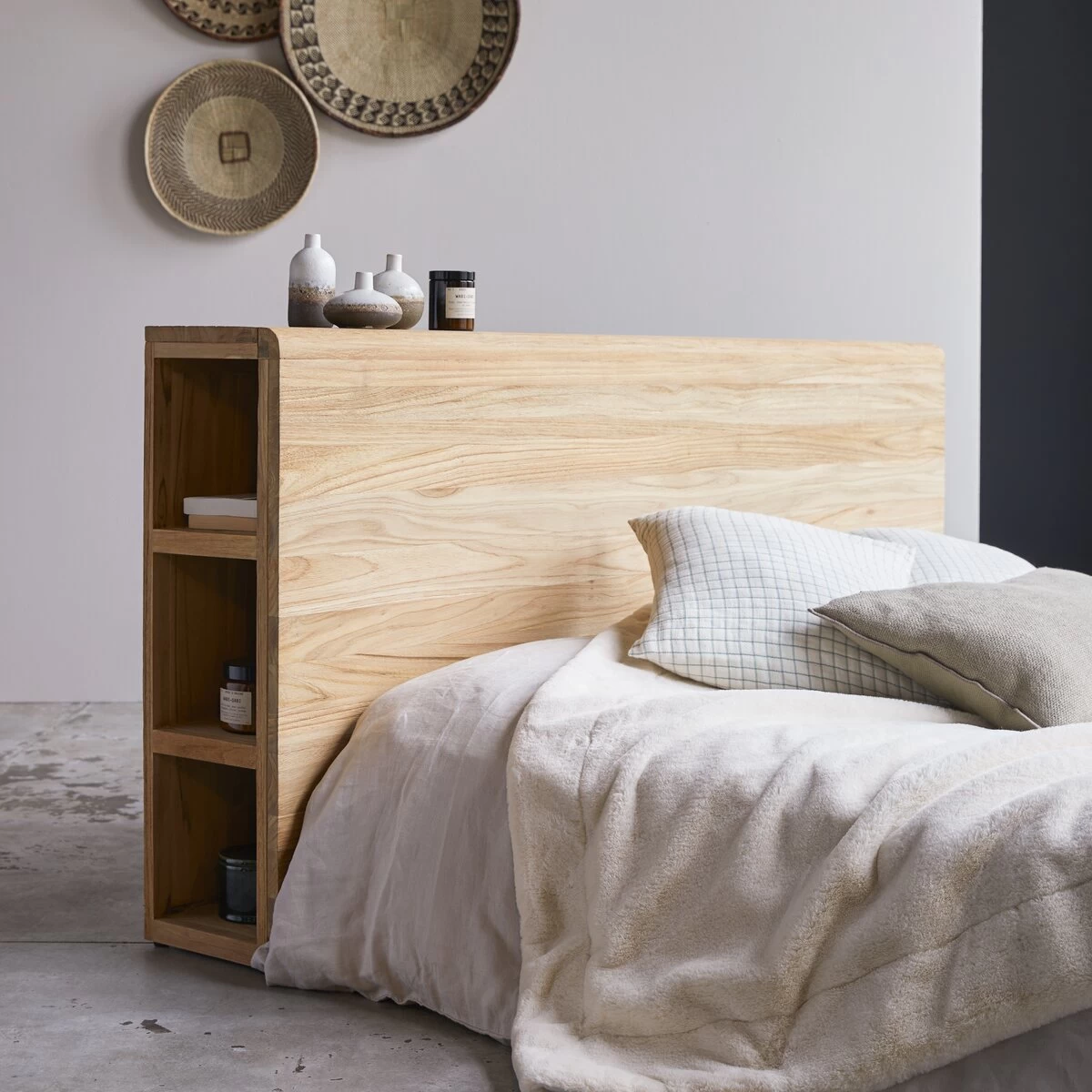 Élégante et tout en sobriété, la tête de lit en teck massif Bertie cache bien son jeu : une astucieuse étagère sur le côté permet de ranger livres, lunettes, téléphone… et tous ces objets qu’on aime avoir à portée de main sans encombrer l’espace ! On aime sa pureté de ligne et son aspect brut obtenu par léger brossage de la matière.