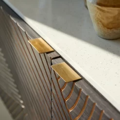 A noter l’originalité des poignées aspect laiton, l’élégance raffinée du piétement (lui aussi aspect laiton) qui allège visuellement l’ensemble et la belle capacité de rangement. Finition par vernis teinté.