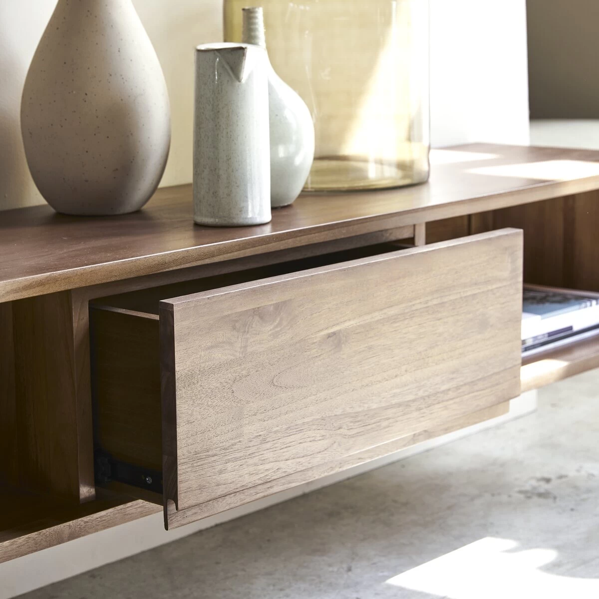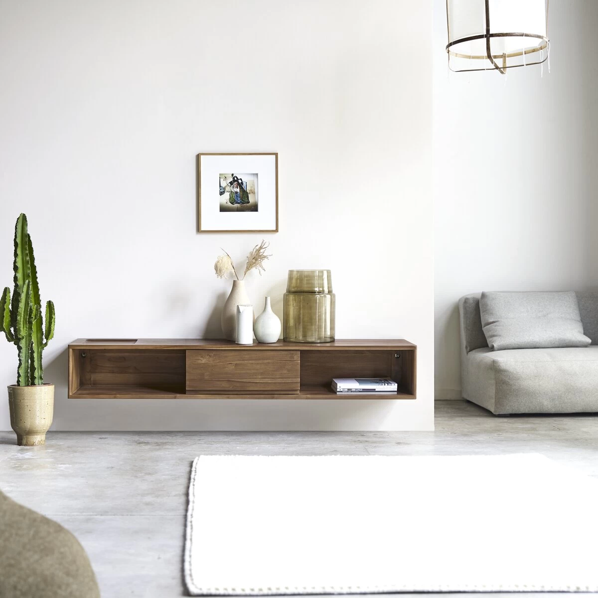 Le banc TV suspendu en teck Circa, existe aussi en version 3 tiroirs et en version 100 cm 2 tiroirs.