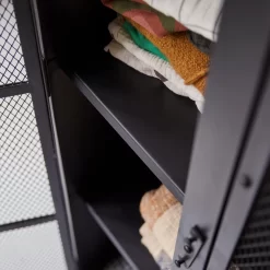 L’armoire grillagée en métal Cléo ouvre la voie à l’imagination des plus jeunes. On s’imagine dans une usine ou dans une caserne de pompiers, on cache ses trésors tout en les exposant, on explore de nouvelles façons de rêver… Comme les portes permettent de voir le contenu, on peut ranger ses jouets et les retrouver facilement et on apprend à organiser ses vêtements de manière esthétique.