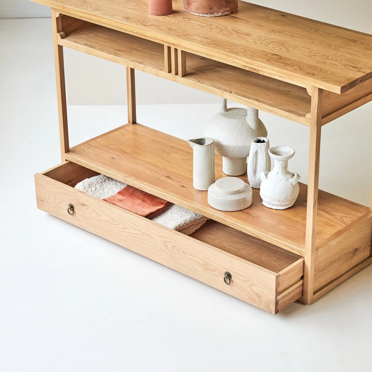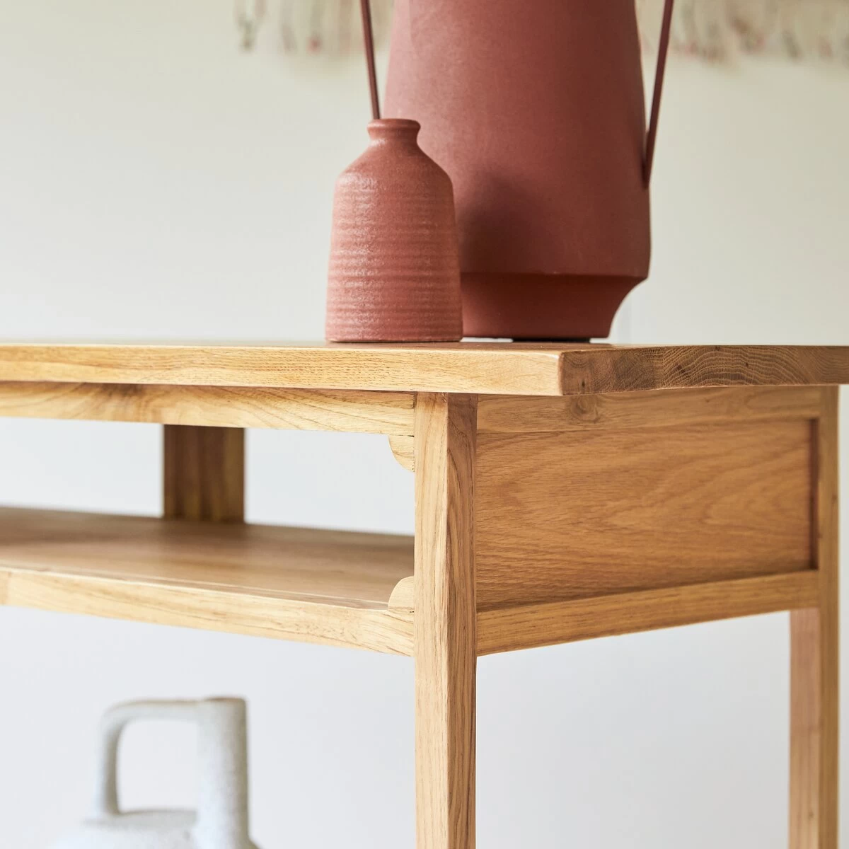 Idéale dans les pièces de vie, la console avec tiroir en chêne massif Clovis trouve aussi sa place dans la chambre ou le bureau… Elle existe dans une version sans tiroir.