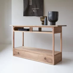 La console en noyer massif Clovis vous est également proposée sans le tiroir à la base. Elle existe dans une autre essence : en chêne massif.