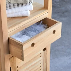 La colonne en teck massif Coline complète avec à-propos le meuble simple vasque ou double vasque Coline. Elle peut aussi être associée aux éléments déjà existants dans votre salle de bain : la blondeur de son bois et la sobriété de sa ligne autorisent de nombreuses associations de style.