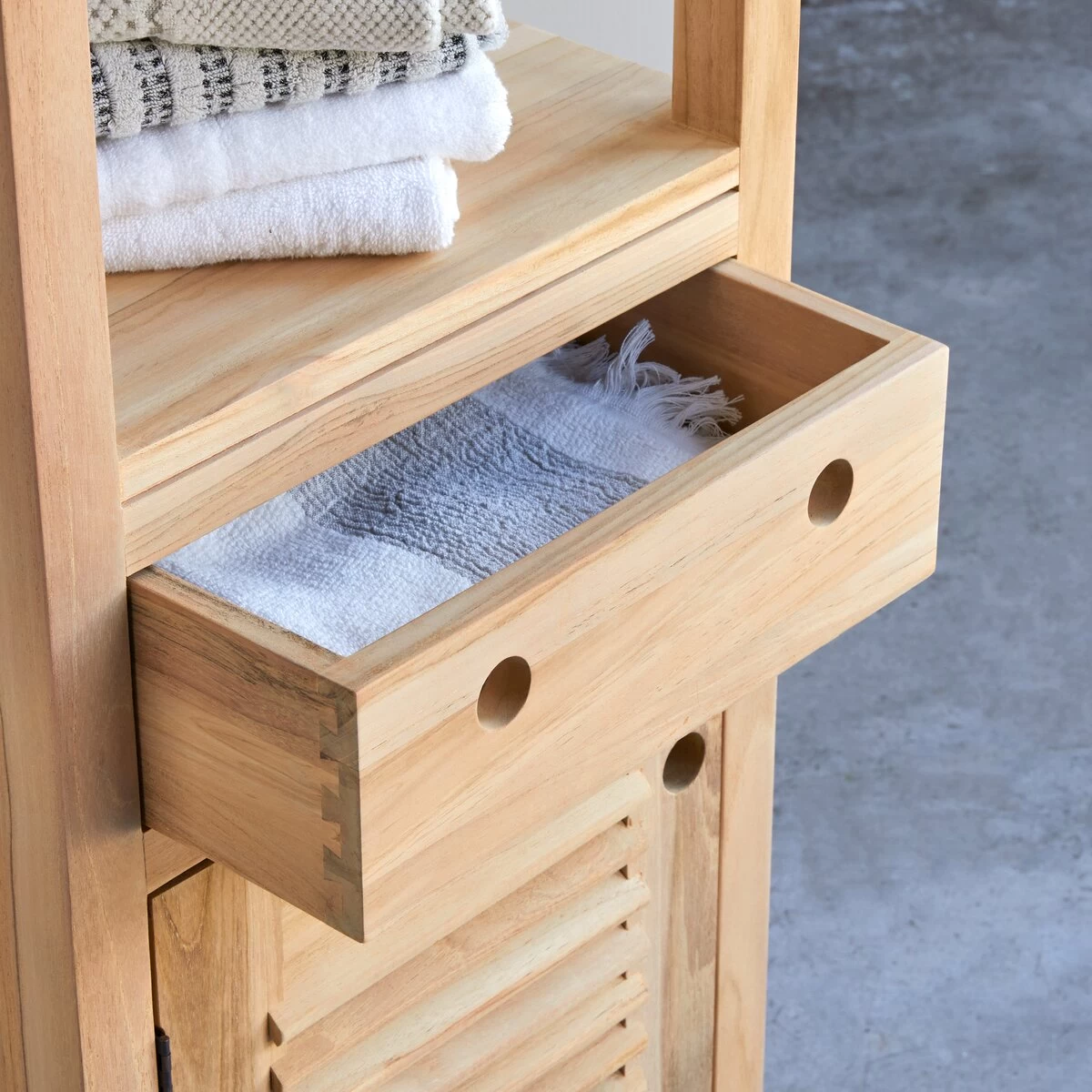 La colonne en teck massif Coline. Petit en encombrement au sol mais grand en termes de rangement, ce meuble combine élégance naturelle et design inspiré d’horizons lointains. Bien pensée, cette colonne permet d’organiser la salle de bain : dans le compartiment du bas, on range les serviettes, draps et tapis de bain, dans le tiroir les petits accessoires qu’on ne veut pas voir traîner et dans le compartiment du haut, les flacons et autres produits de beauté. Quant à la niche centrale, au gré des envies, elle reçoit du linge de toilette ou de beaux objets déco.