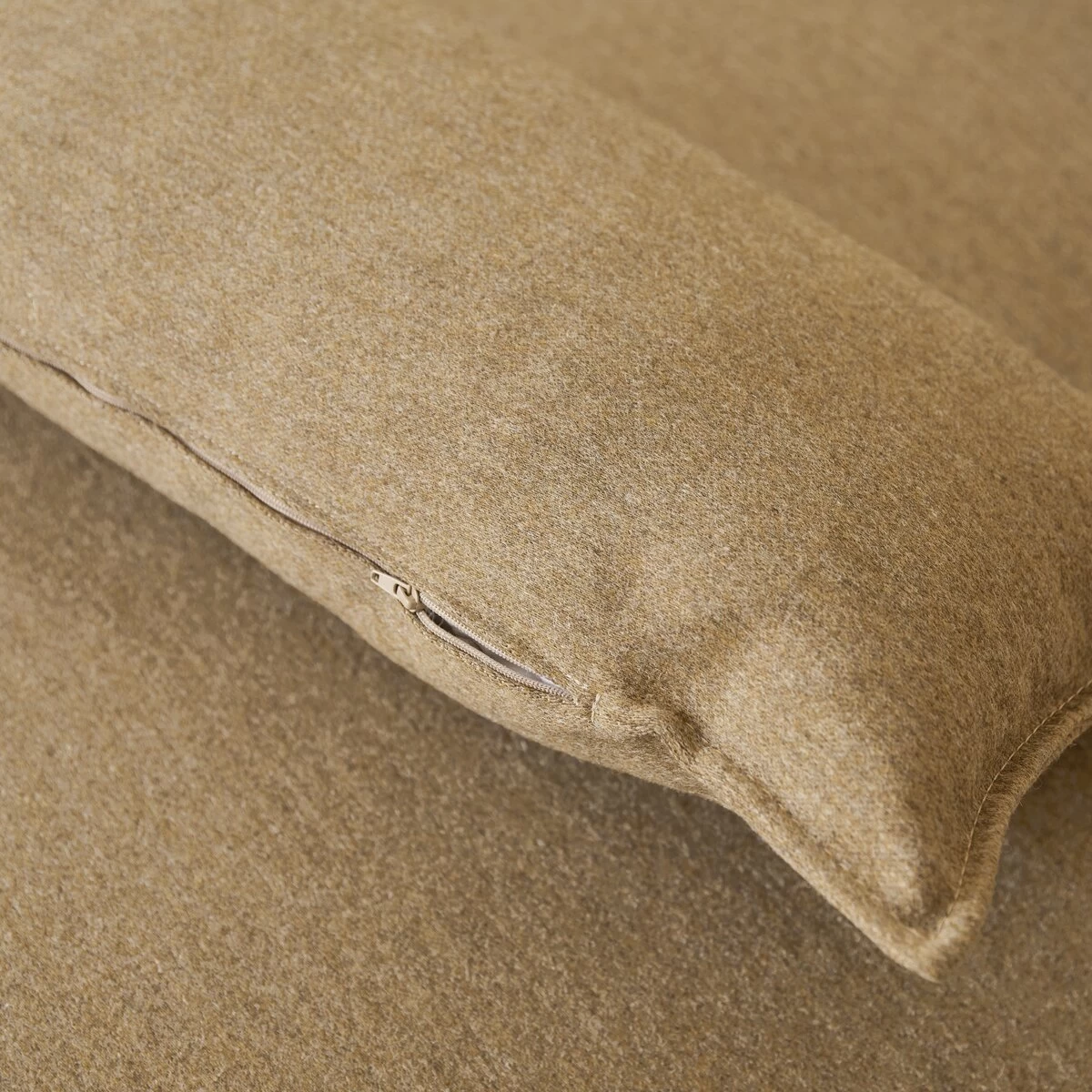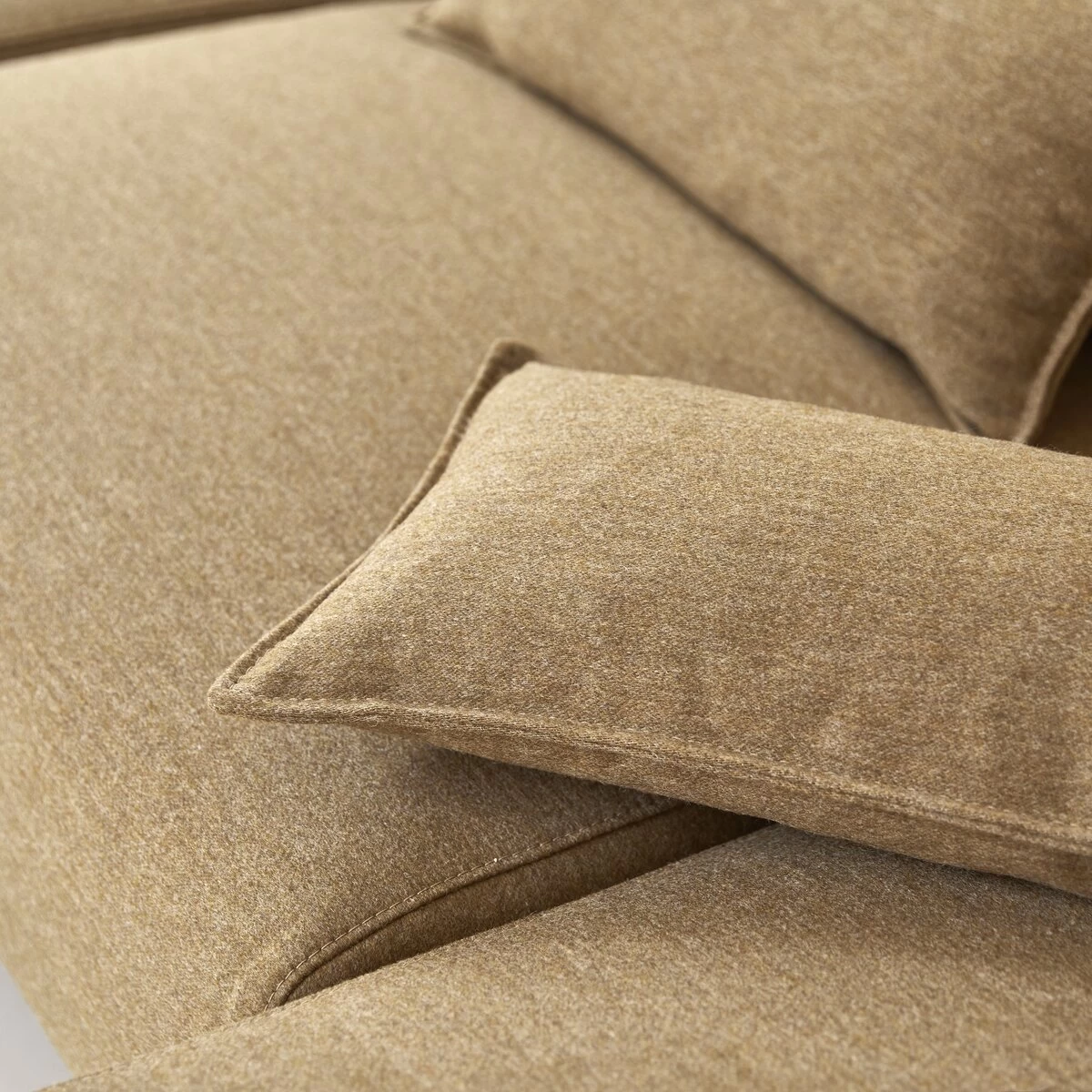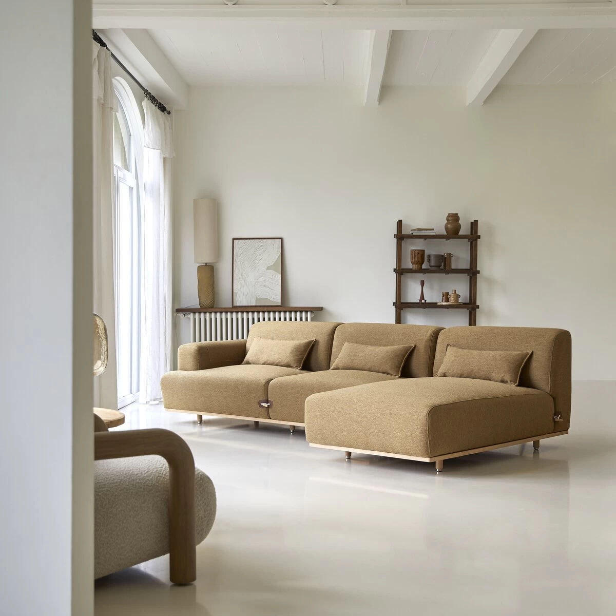 Le canapé d’angle droit Duffle en tissu marron et chêne, signé Bosc Les Landes, affiche des proportions généreuses, une fabrication française haut de gamme et des matériaux de qualité. On aime la singularité de son design – les différents éléments viennent se poser sur la plateforme en chêne verni – et la ligne toute douce rehaussée d’attaches décoratives en cuir et bois inspirées de l’emblématique duffle coat : un charme fou ! On remarque aussi le remarquable travail de tapisserie, les matériaux nobles comme le bois, la laine et le cuir… et les poches ménagées sur le côté pour ranger magazines ou télécommandes. Le chêne est verni pour être facile à vivre au quotidien.