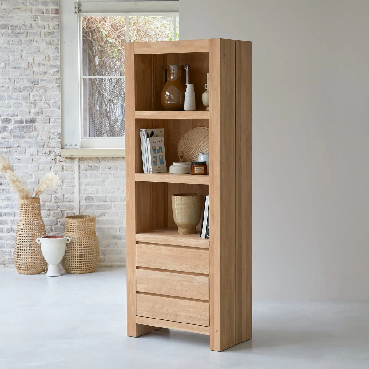 La bibliothèque en chêne massif Eden conjugue sobriété de lignes et authenticité. Travaillée dans un bois aux accents naturels, elle offre design contemporain et belle capacité de rangement pour un encombrement minimum au sol. Idéale pour organiser les livres, elle reçoit aussi de jolis objets déco, des cadres photos ou compose une étagère multimedia dans le salon.