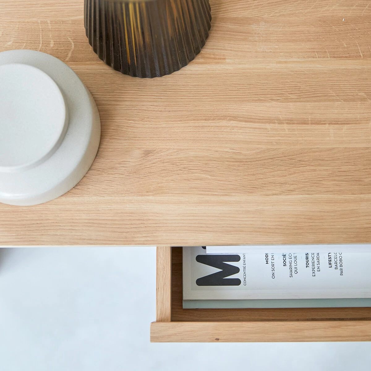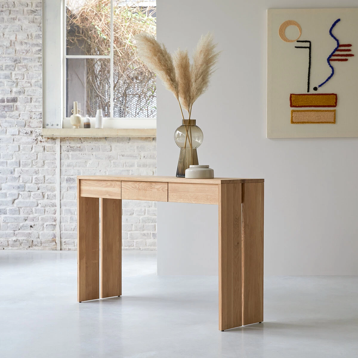 La console en chêne massif certifié FSC® Eden habille avec élégance naturelle toutes les pièces de la maison ! Au salon, elle reçoit de beaux objets de déco… au séjour, elle met en valeur des plantes, cadres photos ou joue les dessertes d’occasion… dans la chambre, elle devient écritoire moderne, dans une entrée spacieuse, elle accueille les sacs et accessoires… Ce ne sont que quelques exemples… chacun lui dédiera le rôle qui lui convient !