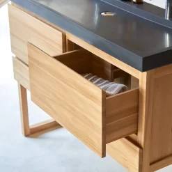 Le meuble de salle de bain en teck massif et pierre de lave 120 Edgar conjugue la blondeur d’un teck massif certifié FSC® au charme intemporel, la sobriété d’un design minimaliste et la modernité d’un plan en pierre de lave. Conçu pour faciliter la toilette de deux personnes en même temps, il organise au mieux les petits matins. Le grand tiroir permet de visualiser d’un seul coup d’oeil tous les accessoires qui y trouvent place. Les deux tiroirs spacieux reçoivent le linge de toilette et les flacons plus gourmands en place.