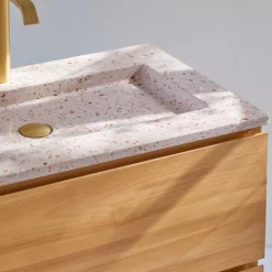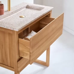 Le meuble de salle de bain Edgar en teck massif et terrazzo premium pink existe également en version 120 cm équipée d’une double vasque. Il vous est aussi proposé équipé d’une vasque en Terrazzo premium Moon en 80 cm et 120 cm. Il existe aussi en céramique et pierre de lave.