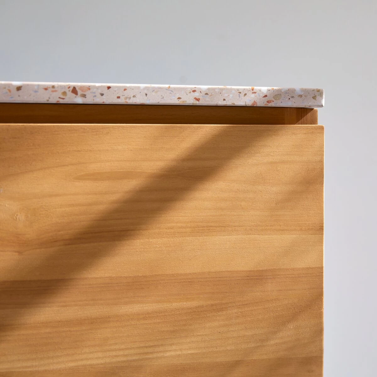 Le meuble de salle de bain Edgar en teck massif et terrazzo premium pink conjugue la perfection de deux matières haut de gamme et l’élégance intemporelle d’un design tout en sobriété. Travaillé dans un bois massif dont les qualités de résistance à l’humidité et au temps ne sont plus à démontrer, il est équipé d’une longue vasque en terrazzo premium, cette incroyable matière composée à 80% de marbre et à 20% d’un liant sans résine.