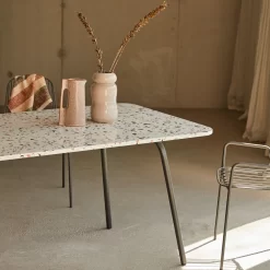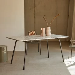 La table rectangulaire en terrazzo premium et métal Elio Brown s’associe avec talent à nos fauteuils et chaises en métal Arty dark grey pour composer un espace repas de 6 personnes. Elle existe aussi en white, grey et en version ronde, idéale pour les petits espaces.