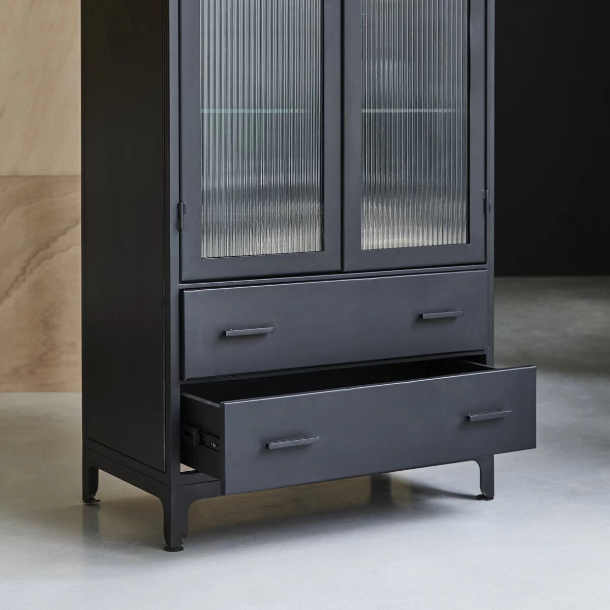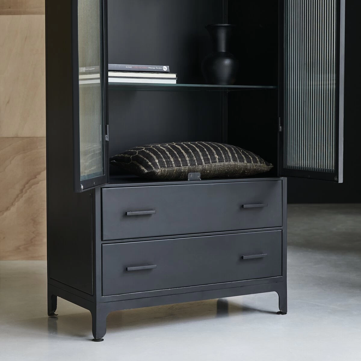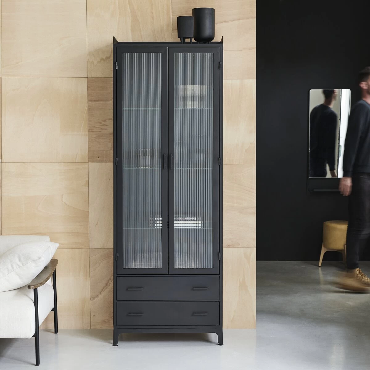 Stylée, la vitrine haute en métal et verre Emil joue l’accord parfait des matières. Elle est aussi proposée en version basse.