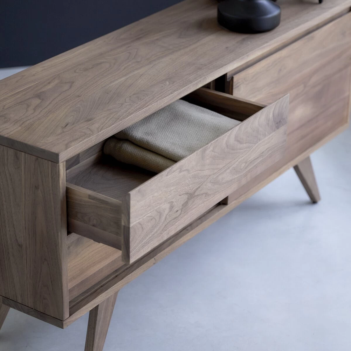 Le buffet en noyer massif Esmée trouve tout naturellement sa place dans le séjour ou la cuisine et offre de nombreux atouts : travaillé dans un bois noble aux reflets mordorés et au veinage apparent, il accueille la vaisselle et le linge de maison avec générosité. On aime la porte coulissante très pratique et les deux tiroirs, parfaits pour ranger tout ce qu’on ne veut pas voir traîner dans le séjour.