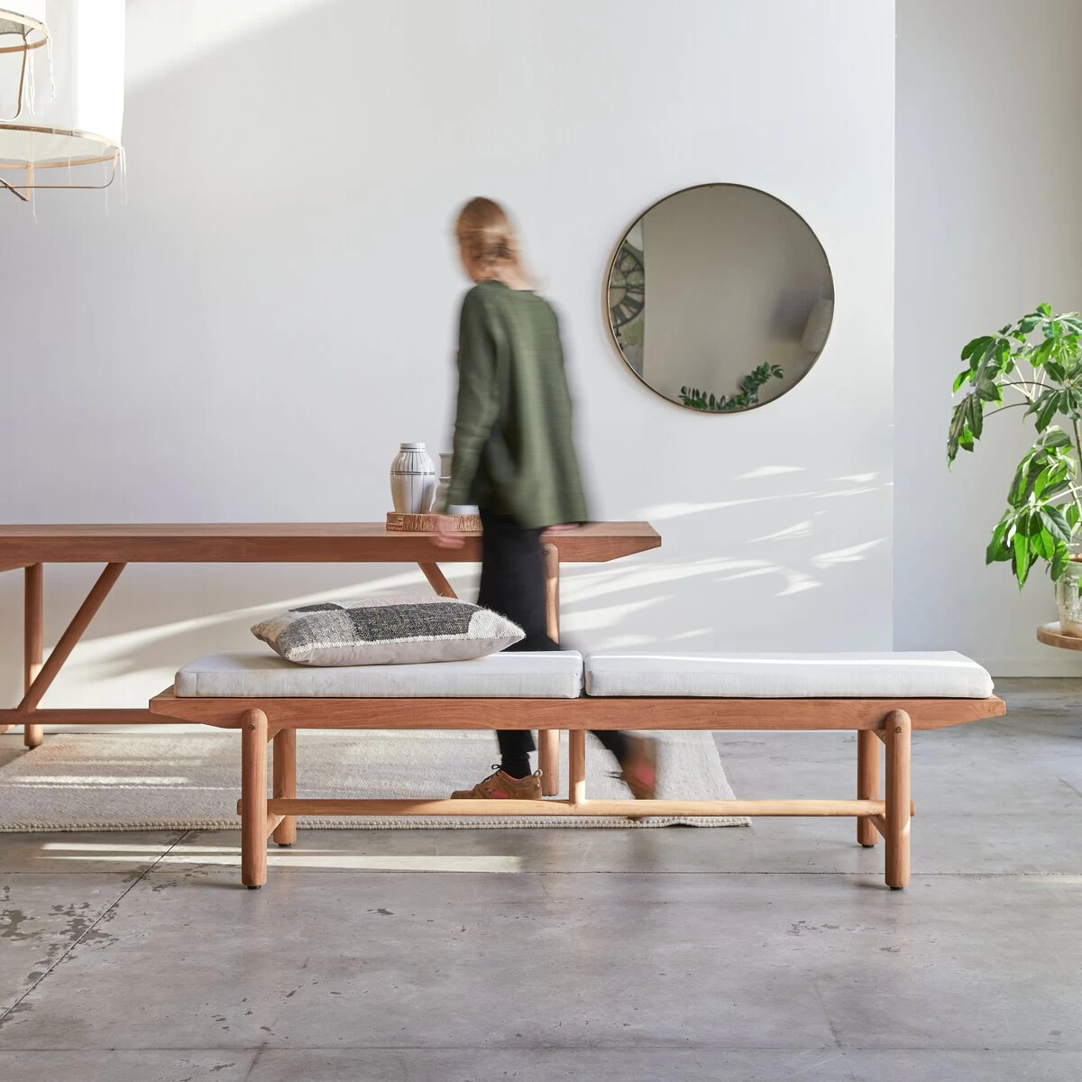 Comme un petit air d’évasion avec le banc en teck massif Fado, un meuble premium qui conjugue prestations de qualité, lignes pures et crée une atmosphère singulière au séjour qui prend alors des allures de jardin d’hiver… une tendance très en vogue chez les designers contemporains ! Ce superbe banc est travaillé dans un bois verni réputé pour ses qualités de résistance aux incidents quotidiens, à l’usure et aux intempéries. Il offre un plan latté de très belle facture, un piétement équilibré pour alléger visuellement l’ensemble, une visserie en laiton et des coussins déhoussables et lavables en machine. Associé à la table en teck massif Fado, il compose un coin repas plein de personnalité… qui s’installe au jardin au gré des envies et des besoins.