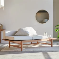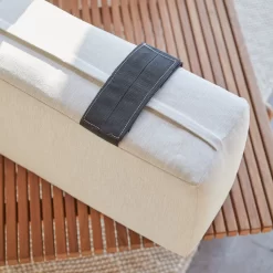 Quand l’esprit outdoor s’invite au salon : la banquette 2 places en teck massif Fado crée une atmosphère de jardin d’hiver ! Meuble haut de gamme, elle offre des prestations de qualité : son plan latté (très apprécié en termes de design contemporain) est travaillé avec le plus grand soin, ses coussins sont déhoussables et lavables en machine, son bois verni est réputé pour ses qualités de résistance aux petits accidents du quotidien, à l’usure et aux intempéries et la visserie est en laiton. C’est un meuble premium qui s’attache à créer un univers propice à la relaxation et aux instants de convivialité. Modulable, à vous d’inventer la banquette que vous préférez : les coussins s’installent de multiples façons, selon vos envies ou vos besoins !
