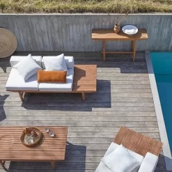 Désormais, les frontières entre aménagement intérieur et extérieur sont gommées : on veut vivre au jardin ou sur la terrasse comme on le fait au salon… L’extérieur est simplement l’extension naturelle de la maison, une pièce supplémentaire où l’on a plaisir à inviter famille et amis. Travaillé dans un bois noble réputé pour ses qualités de résistance aux intempéries et aux UV, ce salon offre des prestations de qualité ; il affiche un design contemporain mis en majesté par des finitions lattées particulièrement soignées et par la conception singulière du piètement qui allège visuellement l’ensemble.