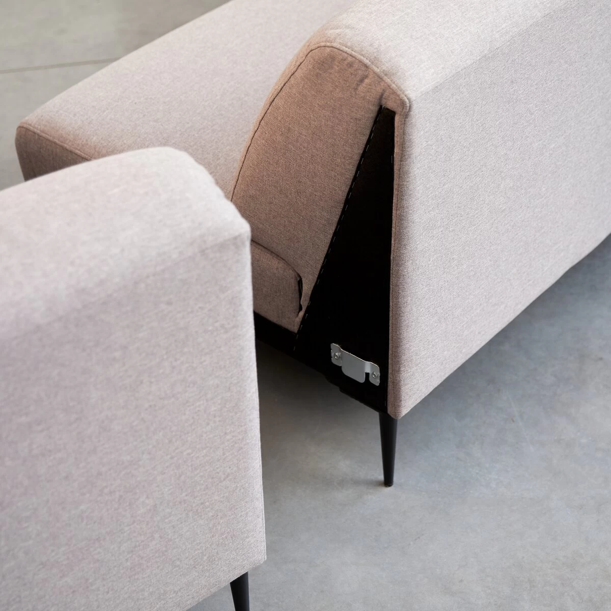Sobriété de lignes et élégance contemporaine pour le canapé d’angle droit Finn qui se métamorphose au gré de vos envies… En effet, selon que vous laissiez les coussins d’accoudoir ou non, le design du canapé est tout à fait différent : ultra minimaliste sans, cosy avec. Travaillé dans un tissu certifié OEKO-TEX®, ce qui garantit l’absence de substances ou de produits chimiques nocifs, il est idéal pour de longues soirées conviviales. Pièce maîtresse de votre salon, il se marie avec tout style de déco intérieure : la sobriété de sa ligne et l’élégance naturelle de son coloris gris permettent toutes les interprétations. A noter, les esthétiques pieds en métal, suffisamment hauts pour permettre à un balai de se glisser sous le meuble.