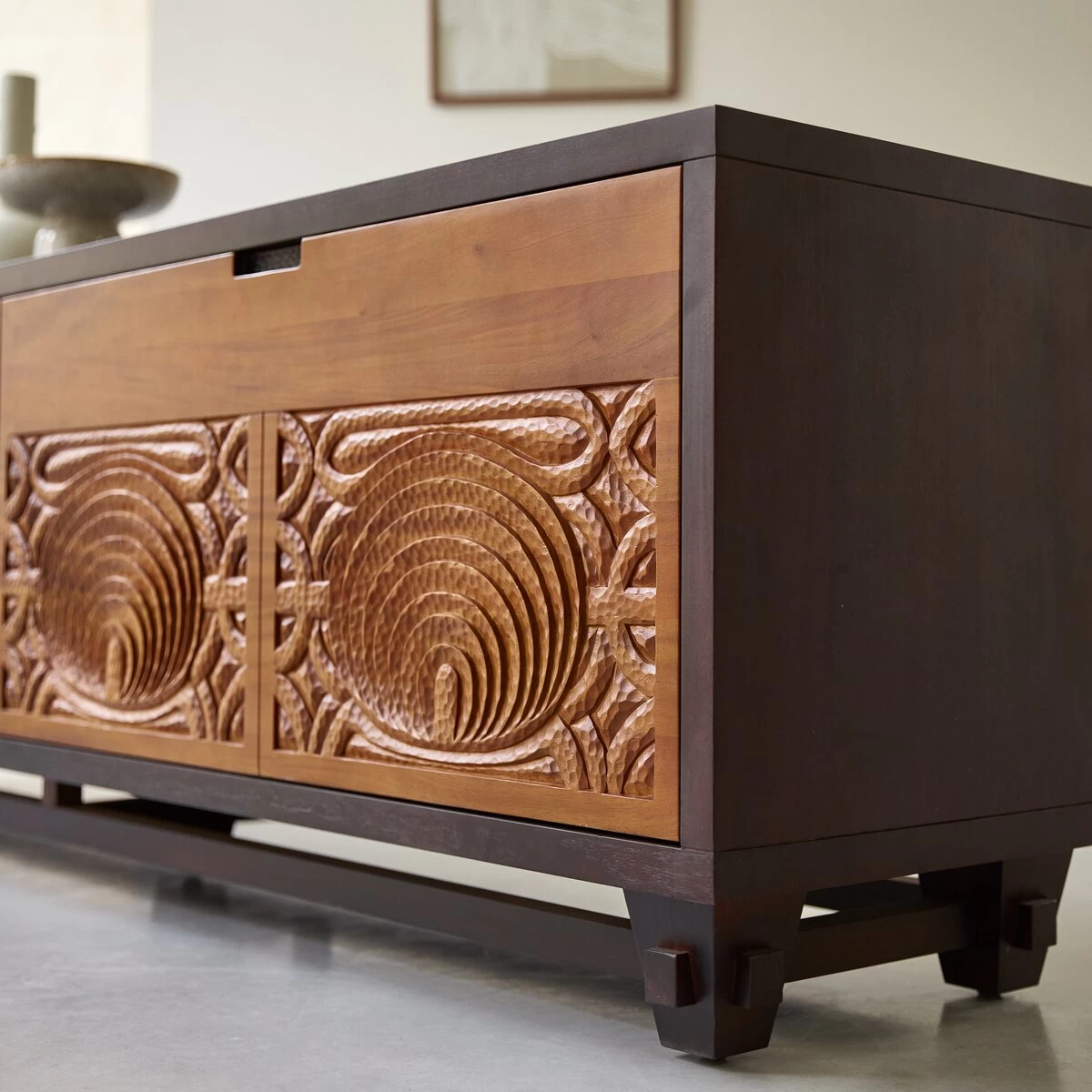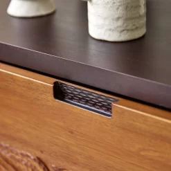 Une façon originale et pleine de personnalité d’organiser tout votre matériel multimédia : le banc TV en acajou massif Frida, l’atout déco de votre salon ! On aime ses portes sculptées du plus bel effet, son inspiration ethnique qui invite au voyage sans quitter la maison et la belle générosité de rangement. On apprécie aussi la conception originale qui permet de tout ranger facilement et le jeu bicolore qui accentue encore l’esthétique atypique de l’ensemble. Une de ces pièces qu’on remarque au premier regard !