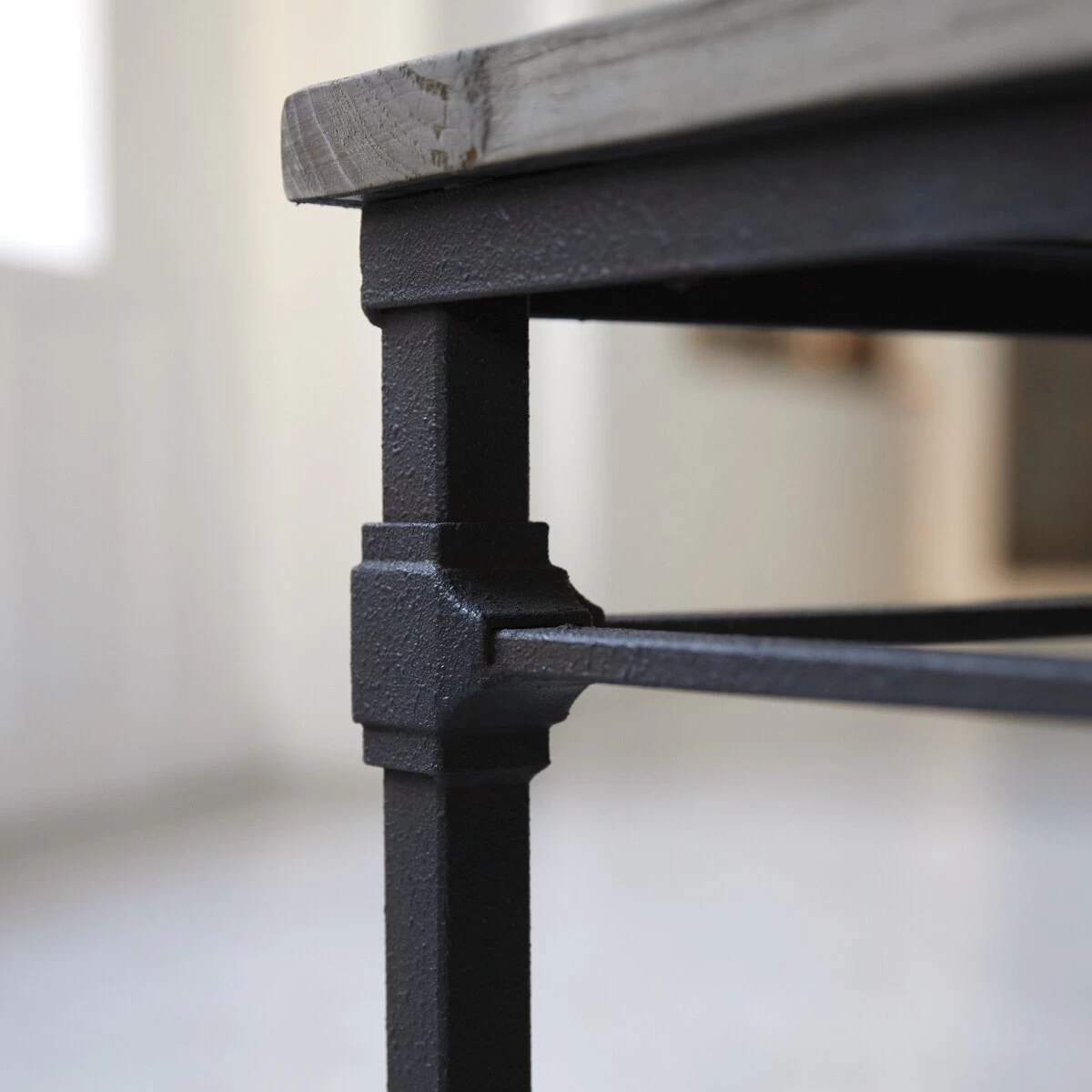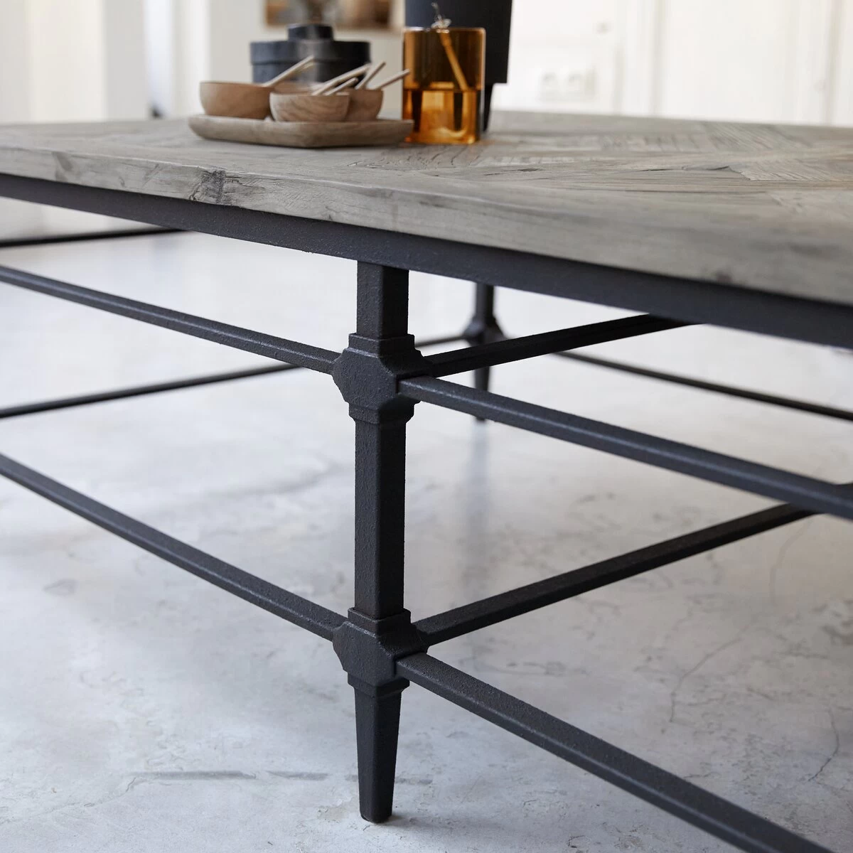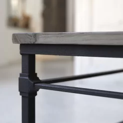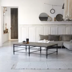 Vous apprécierez les lattes en orme massif recyclé disposées façon parquet ancien sur piètement métal. Le bois de cette table de salon, travaillé par le temps, laisse apparaître quelques imperfections signe d’authenticité.