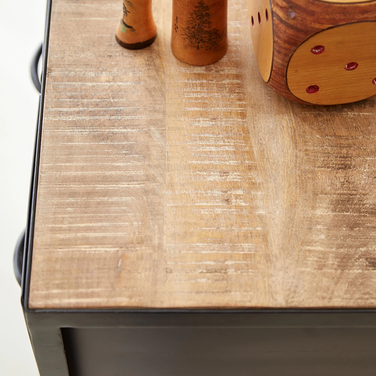 La commode Industriel en métal offre un très beau plateau en manguier massif brut blanchi. Si vous êtes sensible au charme vintage de ce style de déco, voyez aussi notre gamme d’inspiration Industrielle et notre série de meubles à l’esprit Atelier.