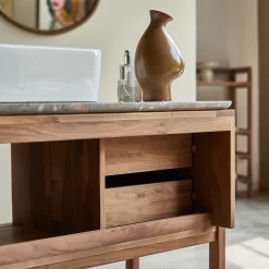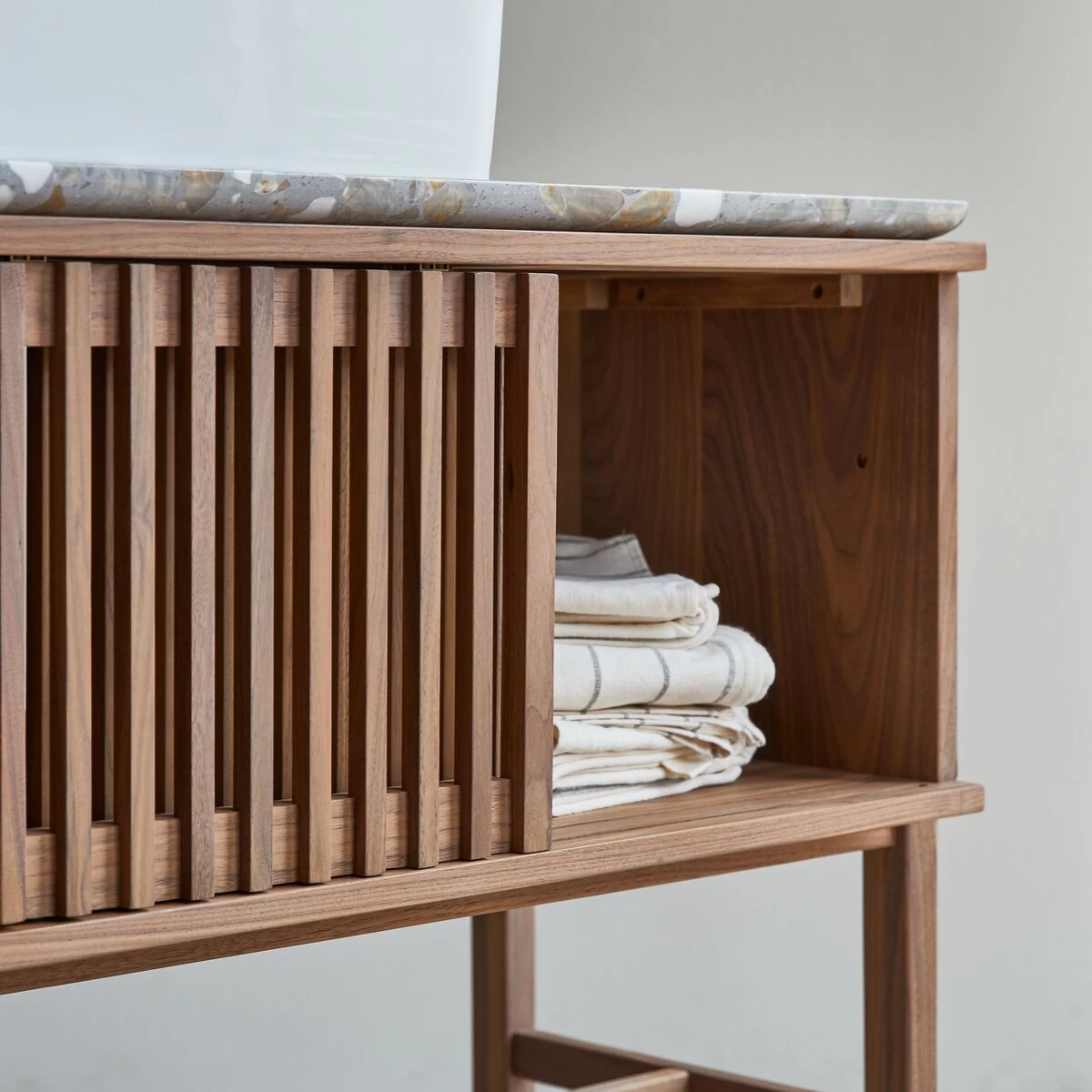Le meuble de salle de bain en noyer et terrazzo premium Isaure est l’une des pièces de notre très belle collection Isaure, une série travaillée dans des matériaux d’exception dont le noyer massif – huilé pour le rendre facile à vivre au quotidien – certifié FSC®, la garantie qu’il est issu de forêts durablement gérées.