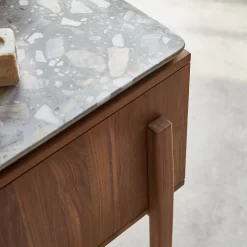 Les meubles de notre collection en noyer et terrazzo premium Isaure se combinent également avec des pièces de notre gamme à l’esprit Naturel.