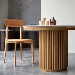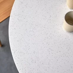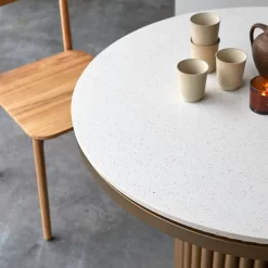 Une table comme une œuvre d’art : la table ronde en métal et terrazzo Isaure sublime votre intérieur ! L’accord parfait entre design et art contemporain pour un meuble sculptural, précieux comme un objet de collection, utile comme un meuble du quotidien. Vous serez sensible aux délicats détails sur le plateau en terrazzo, cette matière lumineuse et facile d’entretien… au cerclage en métal qui vient en souligner la pureté et au pied central en métal lui aussi, inspiré de la création antique. Petit bonus : le pied central permet d’accueillir confortablement jusqu’à 6 personnes ! Au gré des envies, vous lui combinerez des chaises en teck massif Jonak comme sur notre photo ou d’autres chaises d’une belle sobriété, quel qu’en soit le matériau de base.