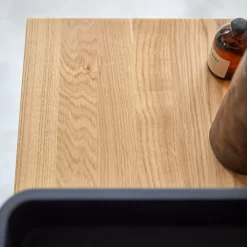 Le meuble de salle de bain suspendu en chêne Jacob offre le double avantage de ne pas occuper d’encombrement au sol (pratique, notamment pour le nettoyage de la salle de bain) et d’offrir une très belle capacité de rangement : les deux profonds tiroirs accueillent le linge de toilette ou les grands flacons… le tiroir long, les lingettes en tissu, les brosses, le maquillage… Plus rien ne traînera dans la salle de bain !