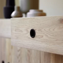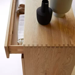 Le buffet en chêne massif Jeanne : un meuble généreux et durable travaillé dans un chêne certifié FSC®, bénéficiant d’une très belle finition brossée et de détails de haute qualité comme les poignées en métal mat et l’assemblage en queue d’aronde. De belles dimensions, il permet de tout ranger efficacement, élégamment et avec modernité. On aime la sobriété du design, la blondeur du bois et les pieds fins qui allègent visuellement la ligne.