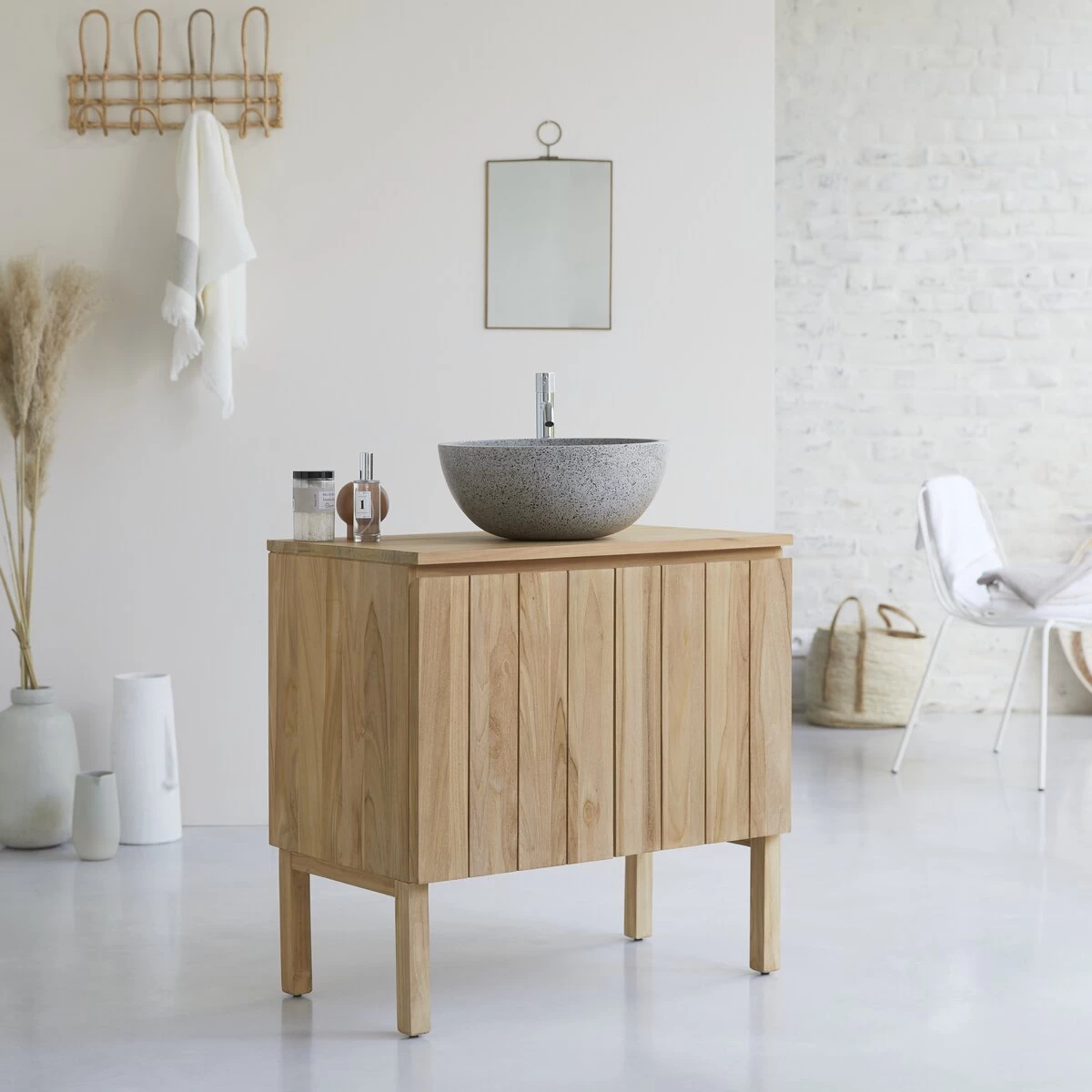 Hommage à la simplicité et au naturel avec le meuble de salle de bain en teck Jill. Travaillé dans un très beau bois massif certifié FSC®, il offre un design lamellé et un coloris clair, agréable à vivre au quotidien. Conçu pour recevoir une vasque à poser, il est ici présenté avec notre vasque en terrazzo Isa grey.