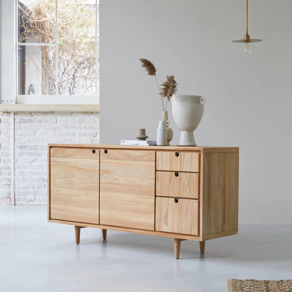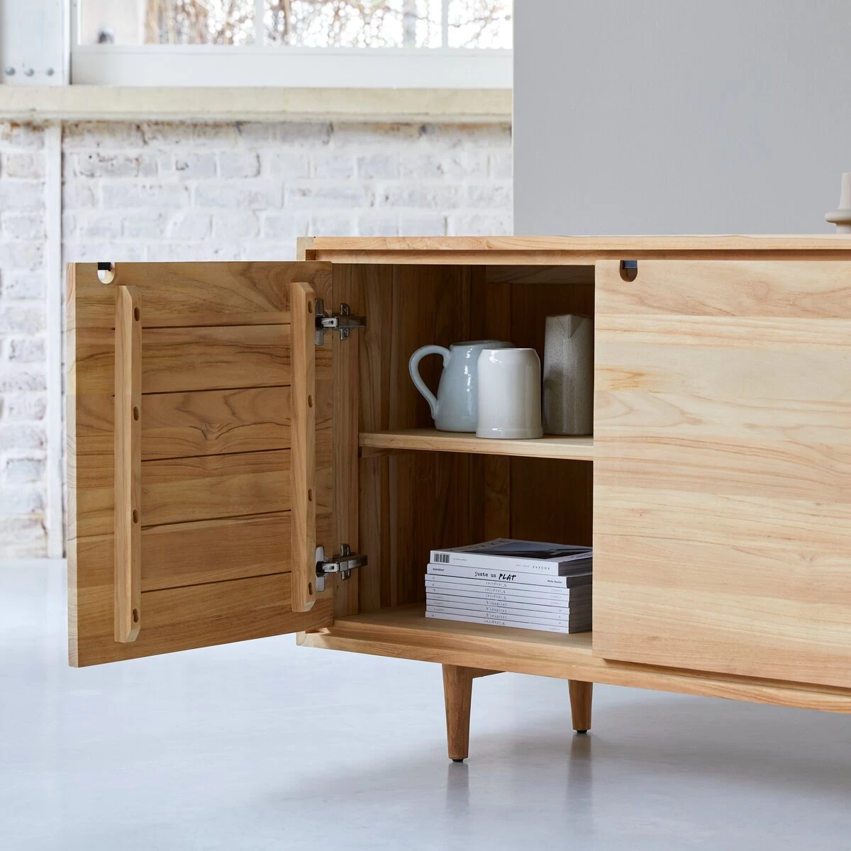 Notre buffet Jonàk est fabriqué en teck massif brut naturel. Parfait meuble de rangement pour le séjour, ses 2 portes battantes et ses tiroirs vous permettront de ranger votre vaisselle et vos textiles de table. Il trouvera facilement sa place au séjour comme au salon, ce buffet en bois de teck apportera une touche moderne à votre intérieur.