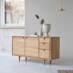 Vous aimerez son style simple et naturel. Son design scandinave aux notes contemporaines est caractérisé par ses pieds obliques ainsi que ses lignes géométriques. Son originalité réside dans la finition naturelle de son bois ainsi que le détail de ses poignées.