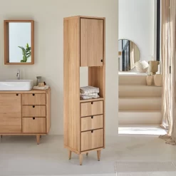 La colonne de salle de bain en chêne massif Jonàk conjugue esprit scandinave très affirmé et belle capacité de rangement pour un encombrement minimum au sol. Dans la partie supérieure fermée par une porte, on range le linge de toilette et dans les trois tiroirs les flacons et autres accessoires de beauté. La niche du milieu peut aussi recevoir des serviettes élégamment pliées ou de jolis objets déco.