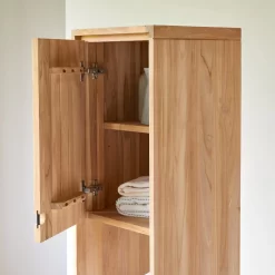 La colonne de salle de bain en teck massif Jonak complète à la perfection le meuble double vasque Jonak pour une pièce d’eau à l’esprit scandinave très affirmé.
