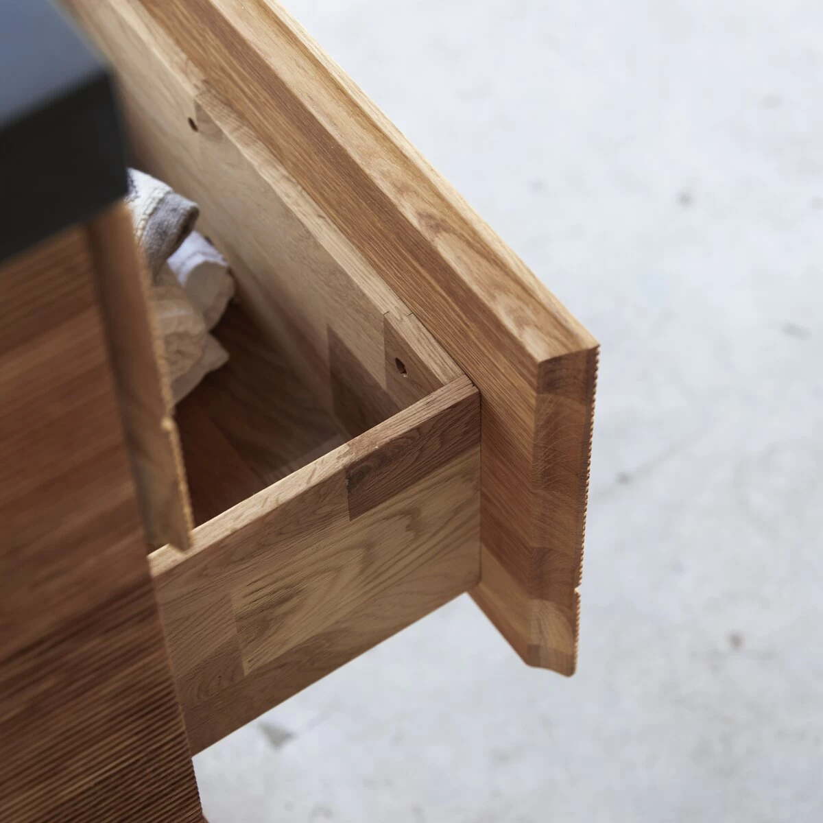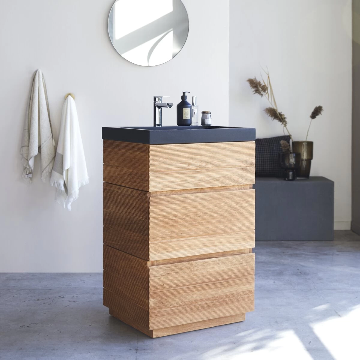 Notre meuble de salle de bain Karl Solo est conçu en chêne massif certifié FSC® et plateau en pierre de lave. Côté rangement, il est muni de 2 tiroirs qui vous offriront la possibilité de mettre à disposition votre linge de maison et vos produits cosmétiques. Son plan vasque intégré en fait un meuble 2 en 1 pour un gain de place optimal. Vous aimerez la mixité des matières : bois de chêne et pierre, pour un effet original et élégant. Vous apprécierez également la texture de son bois de chêne pour un intérieur au caractère authentique et naturel.