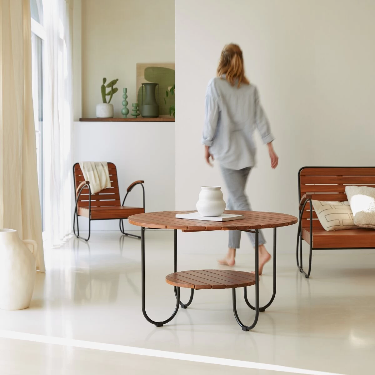 Originale et pleine de personnalité, la table basse en acacia massif Key Wood vous séduira au premier regard ! Entre inspiration industrielle et tendance In and Out, elle trouve sa place dans le salon, une chambre spacieuse… et aux beaux jours, sur la terrasse ou le jardin d’hiver. On aime le mariage réussi du métal et du bois latté, le design tout en rondeur et le double plateau qui permet de glisser magazines, télécommandes, objets déco… La sobriété de sa ligne autorise de nombreuses associations de style et si elle est parfaite associée au fauteuil et au banc en acacia massif Key Wood, elle s’intègre avec autant réussite à votre intérieur.