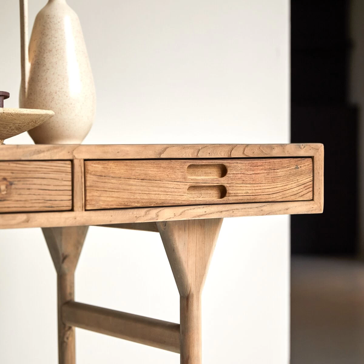 La console en pin et orme recyclés Kim met son design au service de vos plus jolis objets. Elle peut aussi se métamorphoser en un bureau aux lignes épurées. Les 3 tiroirs deviennent alors très pratiques ! Elle fait l’objet d’une finition vernie qui la protège sans masquer sa beauté.