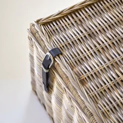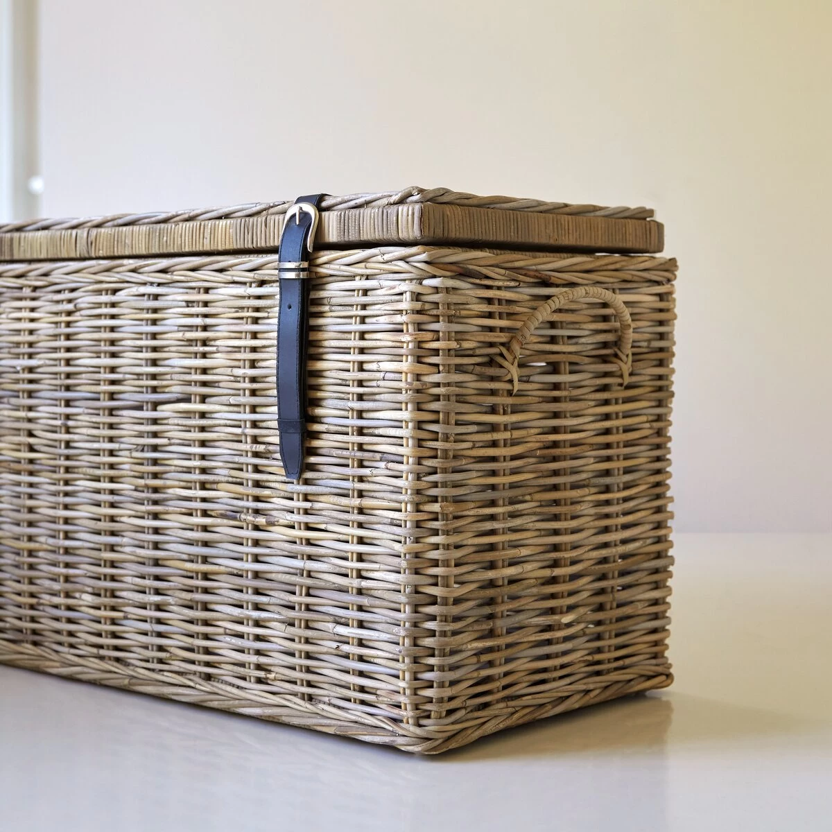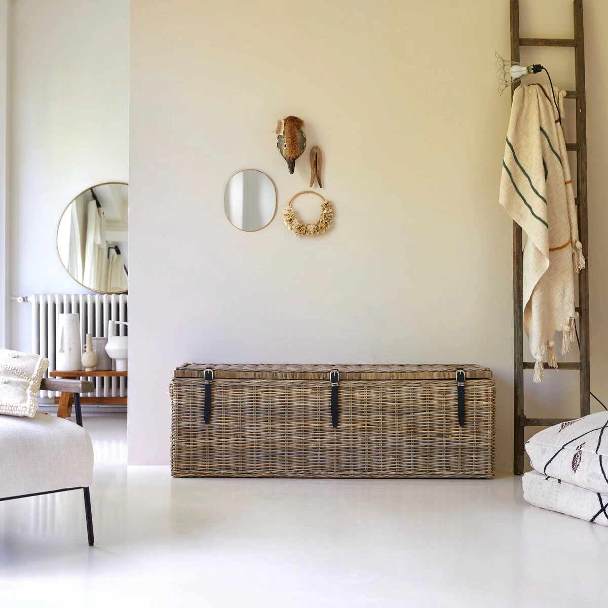 Grand coffre en rotin et lanière en simili cuir. Cette malle de rangement équipée de 3 lanières de fermeture sera très pratique dans votre chambre ou votre salon, pour le rangement de vos textiles et coussins. Laissez vous tenter par la chaleur des fibres et la sobriété de la couleur gris clair, pour un intérieur chic et cozy.