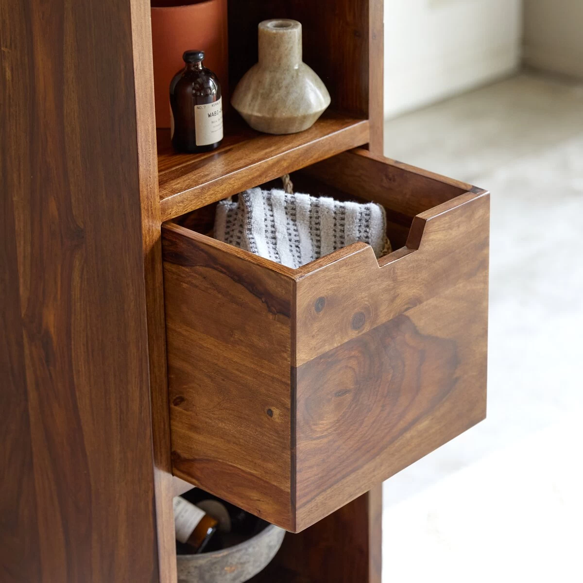 Charmante colonne à suspendre en palissandre aux lignes simples et modernes. Ce meuble de rangement en bois massif est vendu avec 2 tiroirs façon ‘casier’. Très pratique, elle est munie de 3 autres niches dans lesquelles s’adaptent les tiroirs, vous permettant l’optimisation du rangement de votre espace bain à votre convenance. A compléter avec la collection modulable en palissandre massif Kwarto, imaginée pour toutes les pièces de la maison.