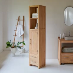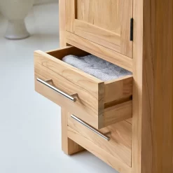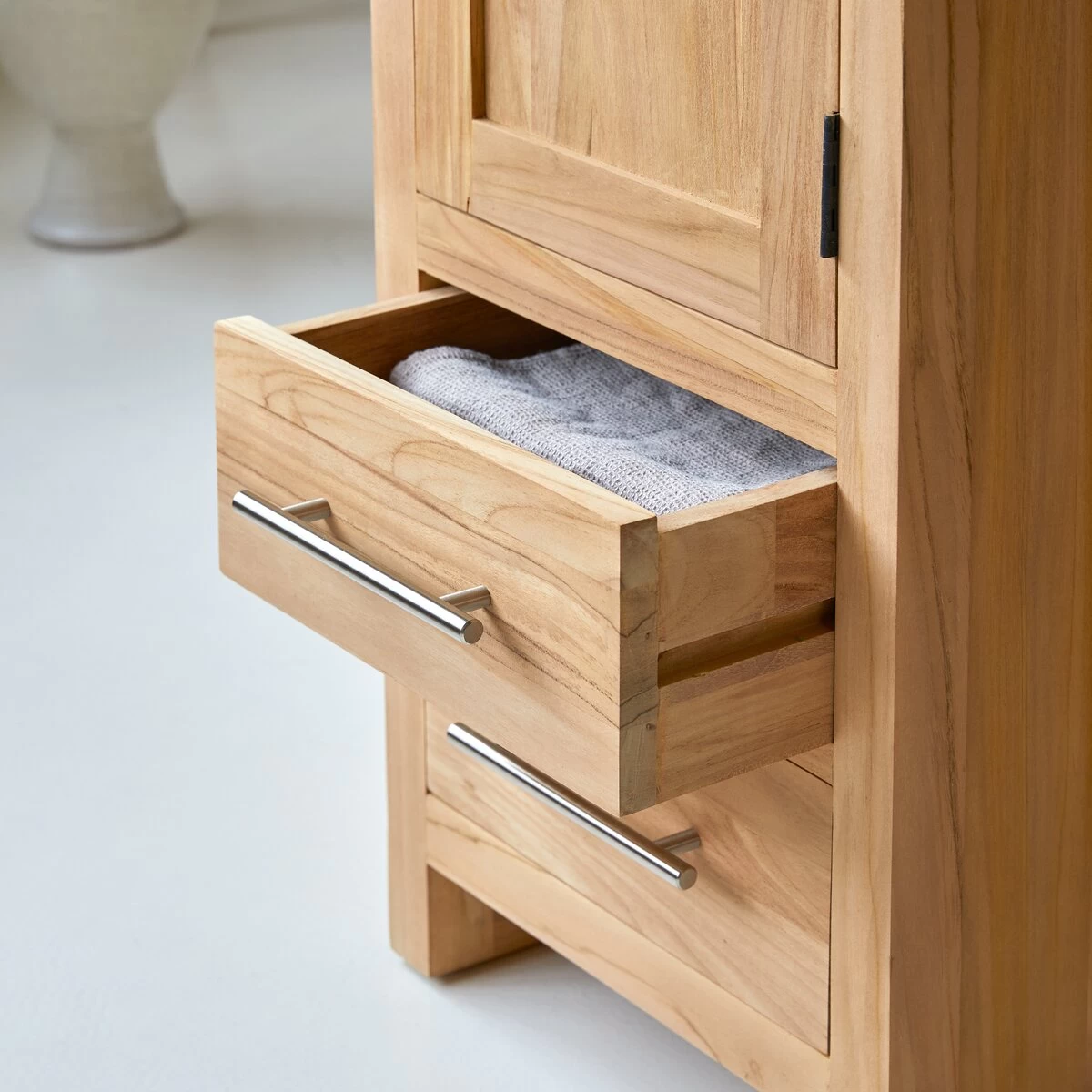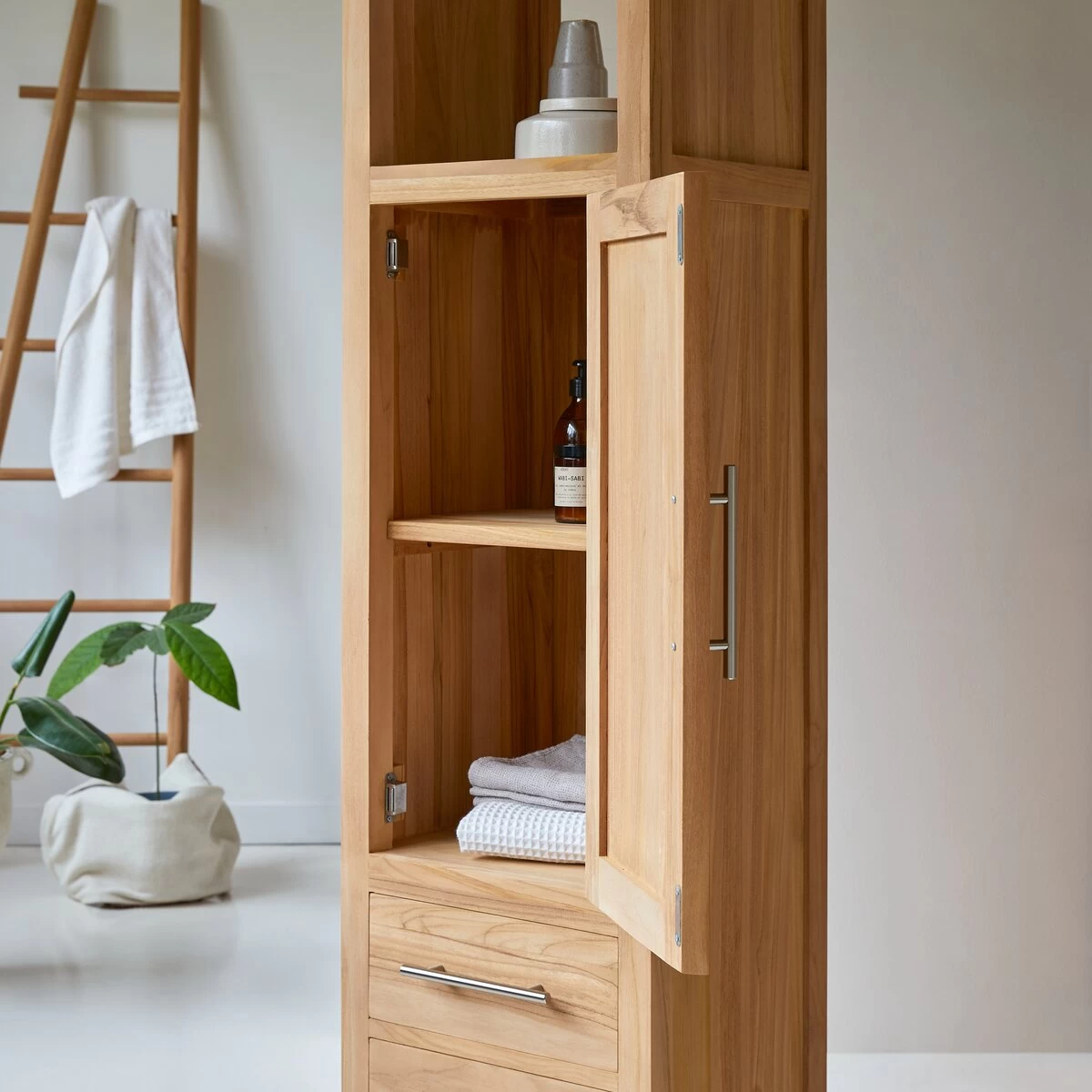 Grande colonne de salle de bain en teck brut. Ce meuble de rangement est composé de 2 niches supérieures, d’une porte ouvrant sur 2 niveaux et de 2 tiroirs.