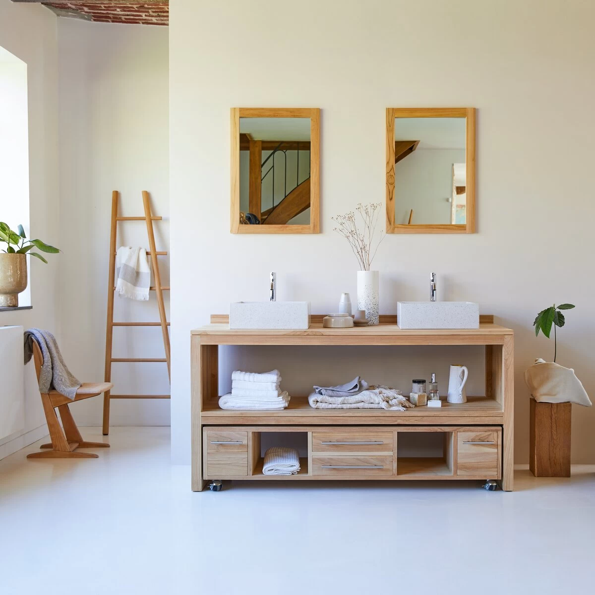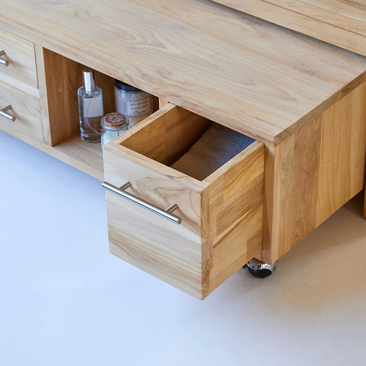 Large meuble de salle de bain en teck massif brut de haute qualité. Conçu pour 2 vasques. ce meuble sous vasque en teck sera du plus bel effet grâce à ses lignes parfaites ! Le meuble de salle de bain en teck Layang Duo est muni d’une niche ouverte et d’un module amovible composé de 4 tiroirs posé sur roulettes. Le meuble sous vasque en teck Layang duo, signé Tikamoon, deviendra incontournable pour votre salle de bain.