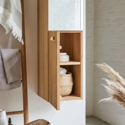 Vous aimerez le caractère naturel et la blondeur de son teck massif, son esprit scandinave et la porte équipée d’un généreux miroir permettant de gagner de la place dans une pièce dont les mètres carrés sont souvent comptés ! Généreux espaces de rangement, système d’ouverture ergonomique (une simple fente laisse la main passer) et système d’accrochage bien pratique !